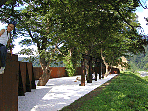 赤錆た鉄板と鉄柱、敷きつめられた白い小石、そして大きな欅。
