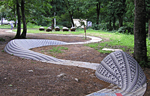 タイルを敷きつめた作品で延々と林の中をうねりながら山の上まで続きます。