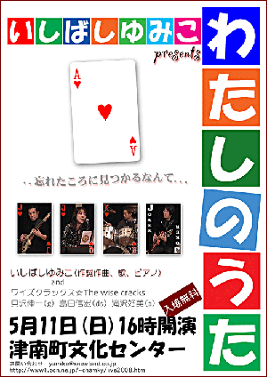 2004年4月に第1回を十日町情報館ホールで開催。 2006年12月には地元津南町の文化センターホールで第2回を開催。 そして今年、第3回目となるコンサートを前回と同じ会場同じメンバーで開催します。 ピアノ弾き語りとアコースティックな感じのトリオ演奏だった04年 ドラムを加えたバンド・サウンドとピアノ弾き語りだった06年 そして今回08年は、よりバンド・サウンドに磨きがかかり、新曲もたくさん披露します。 よりパワーアップした『わたしのうた』をお楽しみください。と意気込み... そして終わりました...余韻...よいん... まあ良かったです、楽しかったです、お客さんがもっともっと欲しかったです(笑) |