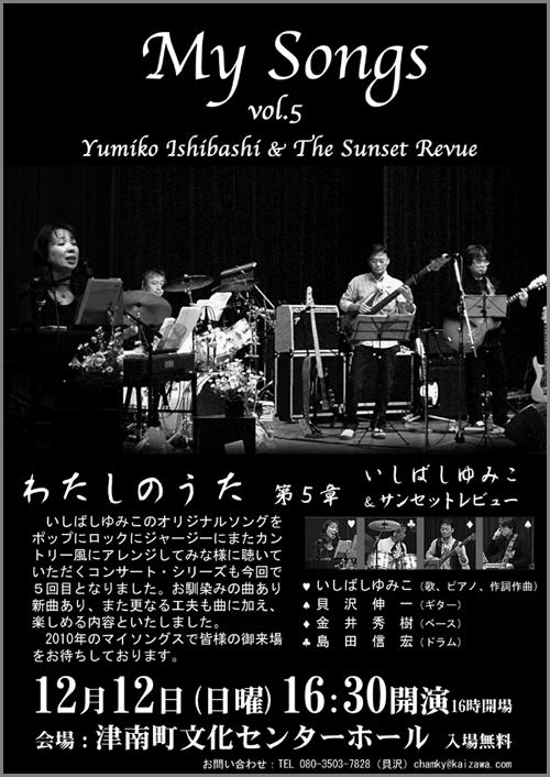 出演:いしばしゆみこ&サンセット・レビュー 2004年4月に第1回を十日町情報館ホールで開催。 その後は地元津南町の文化センターホールで回を重ね、 今年の第5回も馴染み津南町の文化センターホールで12月12日に開催となりました。 同じメンバーで年間を通して練習を重ねることが出来たため、 前からの曲にも更なる工夫をアレンジに加えることができましたし、 新曲にも取り組み、ライブのレパートリーに加えることができました。 オリジナル曲をバンドで演奏するという、ごく当たり前のことですが それを続けているバンドも地方では少なくなっているようです。 オリジナルを楽しむ平均年齢50歳のロック・バンド(オヤジ・バンドじゃない)の意気込みを 是非聴いていただきたいと思いが強くあります。 バンド名をワイズクラックスからサンセット・レビューに変えたのは