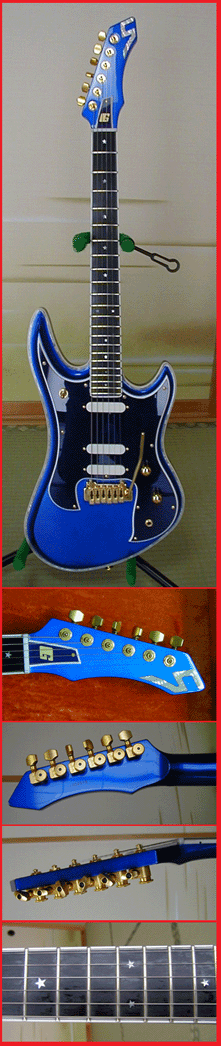 ところで、本題に入りますが前述の通り、お仲間の末席を汚しながらも「グヤトーンのシャープ・ファイブ・モデル」を一本も持ってなかった小生は、明るく言い訳する事も出来ずに、ついに最新のマークIVモデル(ブルー)をば入手いたしましたよ。本当はもっと後年になって、ギター人生最後の夢として購入する予定でしたのに!(金欠お父さんには痛い出費でした。実際!なにせ、小遣いが月2万円ですから。アハハハ。涙!)それに、もちろん女房殿や子供達にも内緒で買ったものですから、現在は日陰者状態です。(三根先生、ごめんなさい!)といった訳で今回は、三根先生が心血を注いで開発された「ニューモデル」の紹介とさせて頂きます。(いやいや、徹底解剖といきましょう!でも、バラせませんので透視しますよ。エレキ親父は最近、妄想から透視にまで進化してきました。でも、覗きじゃありませんよ。誤解なきよう!)