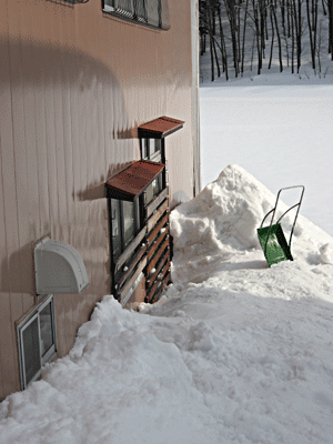 右手の緑色の道具が雪国で名高い(かどうか?)スノーダンプです。
